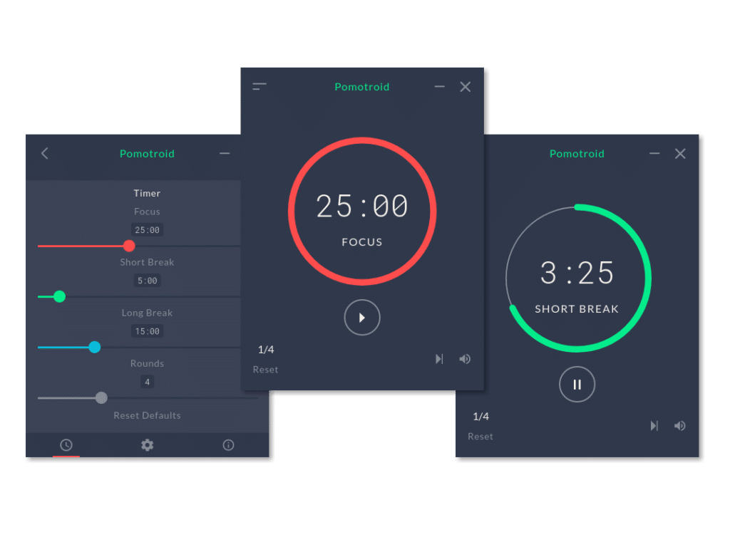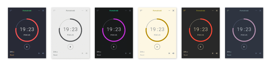 Pomotroid provides many themes. It’s also theme-able, allowing you to customize its appearance.